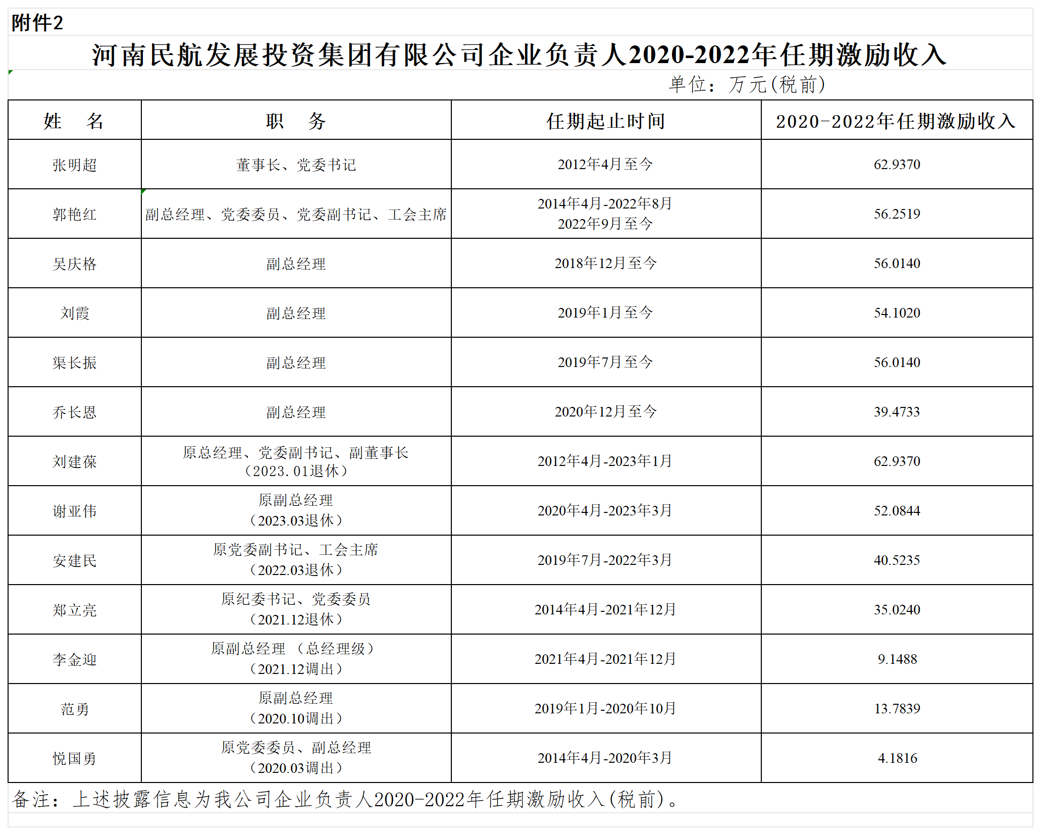 河南民航發(fā)展投資集團有限公司企業(yè)負責(zé)人2022年度薪酬及2020-2022年任期激勵收入情況