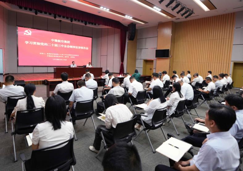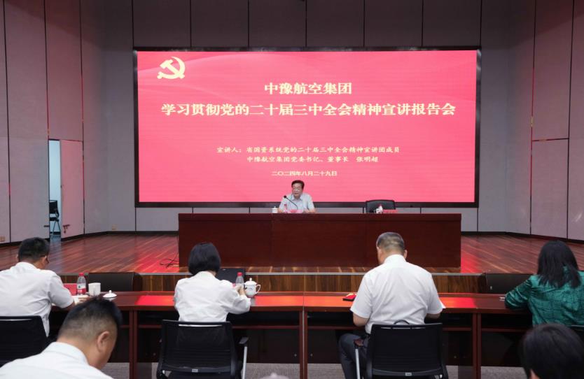 8月29日,按照省委和省政府國資委黨委部署,中豫航空集團舉行學習貫徹黨的二十屆三中全會精神宣講報告會。省國資系統(tǒng)宣講團成員,中豫航空集團黨委書記、董事長張明超作宣講報告,黨委副書記、總經(jīng)理、副董事長柳建民主持會議,集團領(lǐng)導班子在鄭成員、中層管理人員、青年員工代表約300人參會。