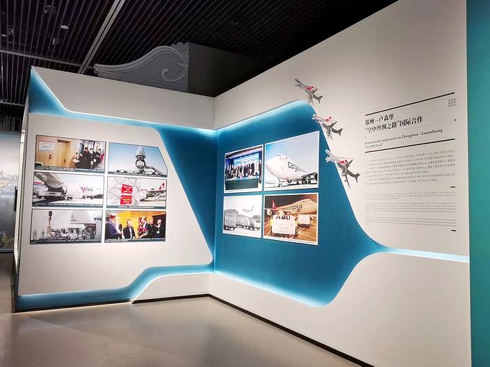 這一主題展板上,精選了10張圖片記錄豫盧共建“空中絲路”的關(guān)鍵事件。既有2014年河南航投與盧森堡貨航在鄭州簽署股權(quán)合作協(xié)議、“鄭州號”巨無霸貨機首次抵鄭的起始節(jié)點;也有這條絲路承運河南省向盧方捐贈的抗疫物資、鄭盧直飛客航首批旅客抵達的溫暖瞬間;還有盧森堡貨航在鄭州加注可持續(xù)航空燃料、鄭盧航線貨運量突破100萬噸的喜慶時刻,精彩講述豫盧雙方在“一帶一路”框架下相融互促,從硬聯(lián)通、軟聯(lián)通到心聯(lián)通的生動實踐。