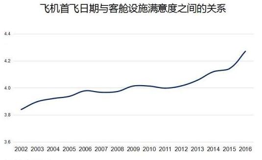 上圖是飛機(jī)首飛日期與客艙設(shè)施滿意度之間的關(guān)系,可以看出首飛日期越近滿意度越高,首飛日期越早滿意度越低,而且是持續(xù)地降低。“也就是說(shuō)我們?nèi)说男枨笤谧兓?,我們得跟上人的需求變化。行業(yè)的標(biāo)準(zhǔn)是持續(xù)的在升級(jí)的,我們需要往前追趕?!?