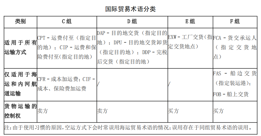 在國(guó)際貿(mào)易的貨物銷售合同中,進(jìn)出口商使用國(guó)際商會(huì)《國(guó)際貿(mào)易術(shù)語解釋通則》(Incoterms),界定買賣雙方在風(fēng)險(xiǎn)、成本、運(yùn)輸和保險(xiǎn)方面的義務(wù),避免誤解、爭(zhēng)議與因此導(dǎo)致的損失以及其他法律難題。根據(jù)最新的《國(guó)際貿(mào)易術(shù)語解釋通則》2020版,國(guó)際貿(mào)易術(shù)語共分成2類4組11個(gè)。