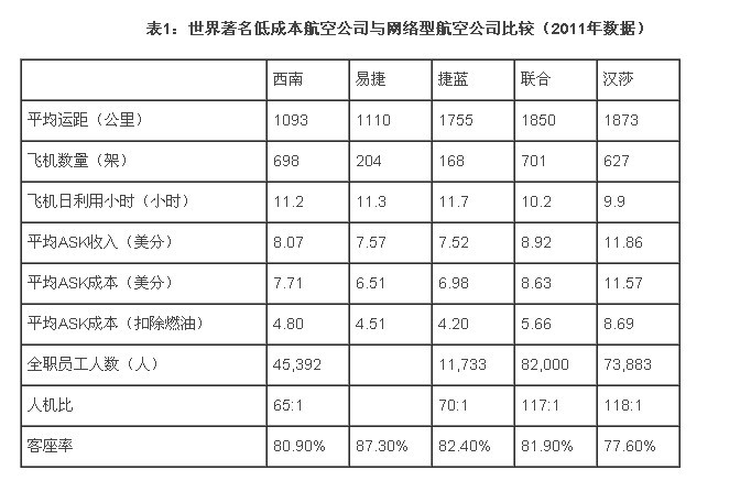 為了便于比較,本文選擇了我們普遍認(rèn)可的低成本航空公司與較為熟悉的網(wǎng)絡(luò)型航空公司2011年的報(bào)表數(shù)據(jù),分別從平均運(yùn)距、機(jī)隊(duì)規(guī)模、飛機(jī)日利用率、平均ASK收入與成本、以及客座率與人機(jī)比等項(xiàng)目進(jìn)行比較(如表1)。